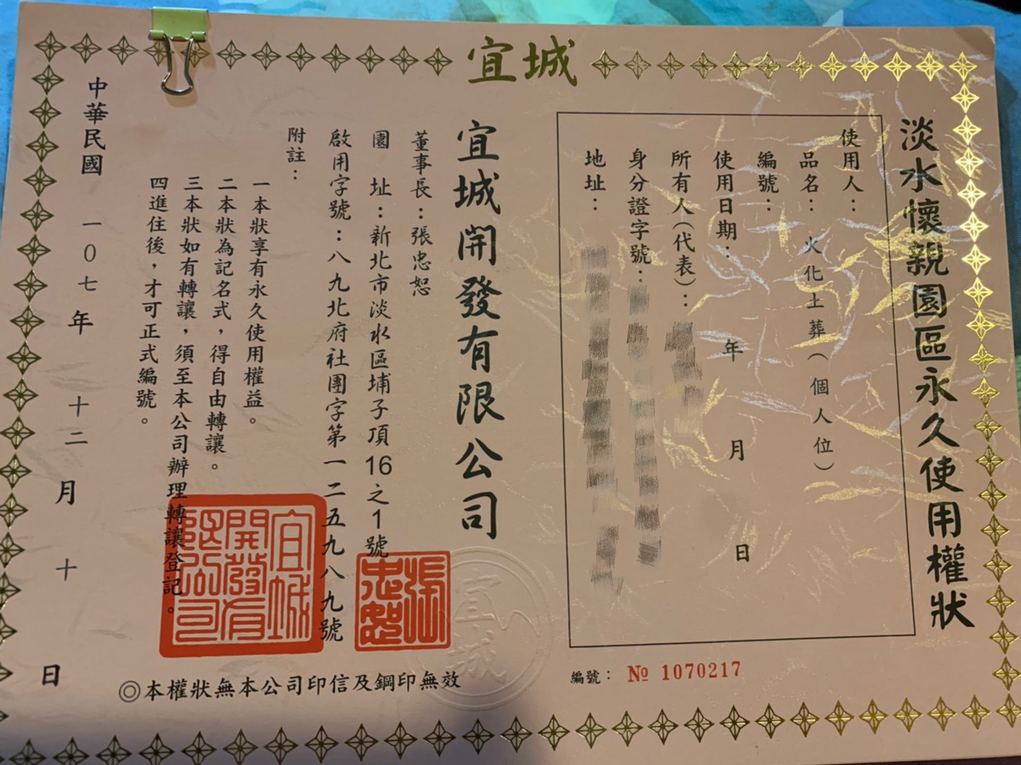 淡水宜城墓園 平面式火化土葬區永久使用權狀含骨灰罐